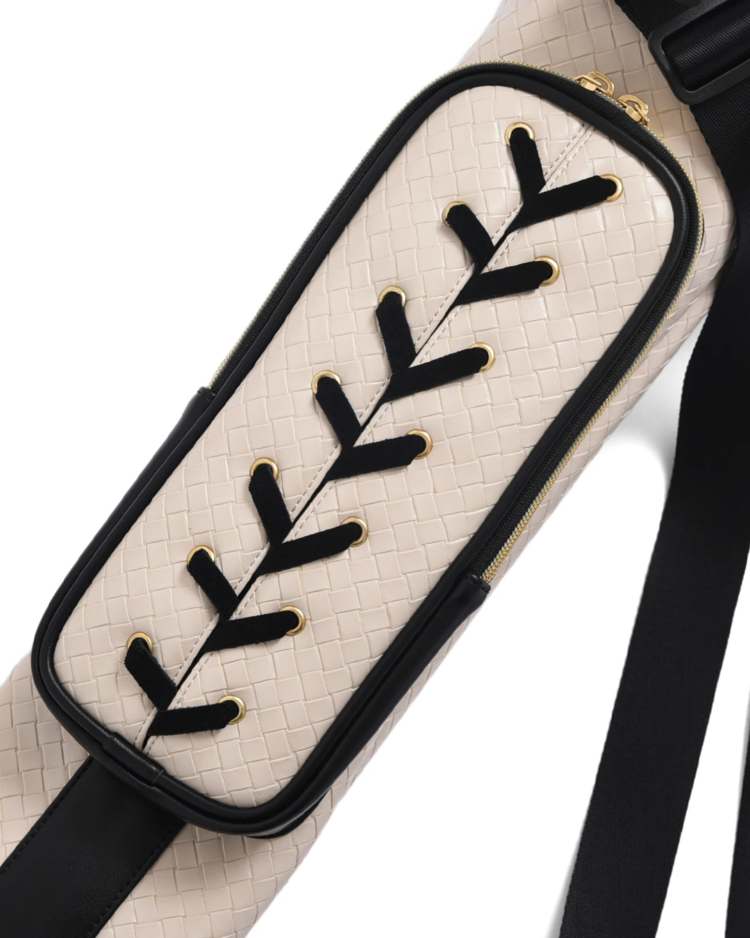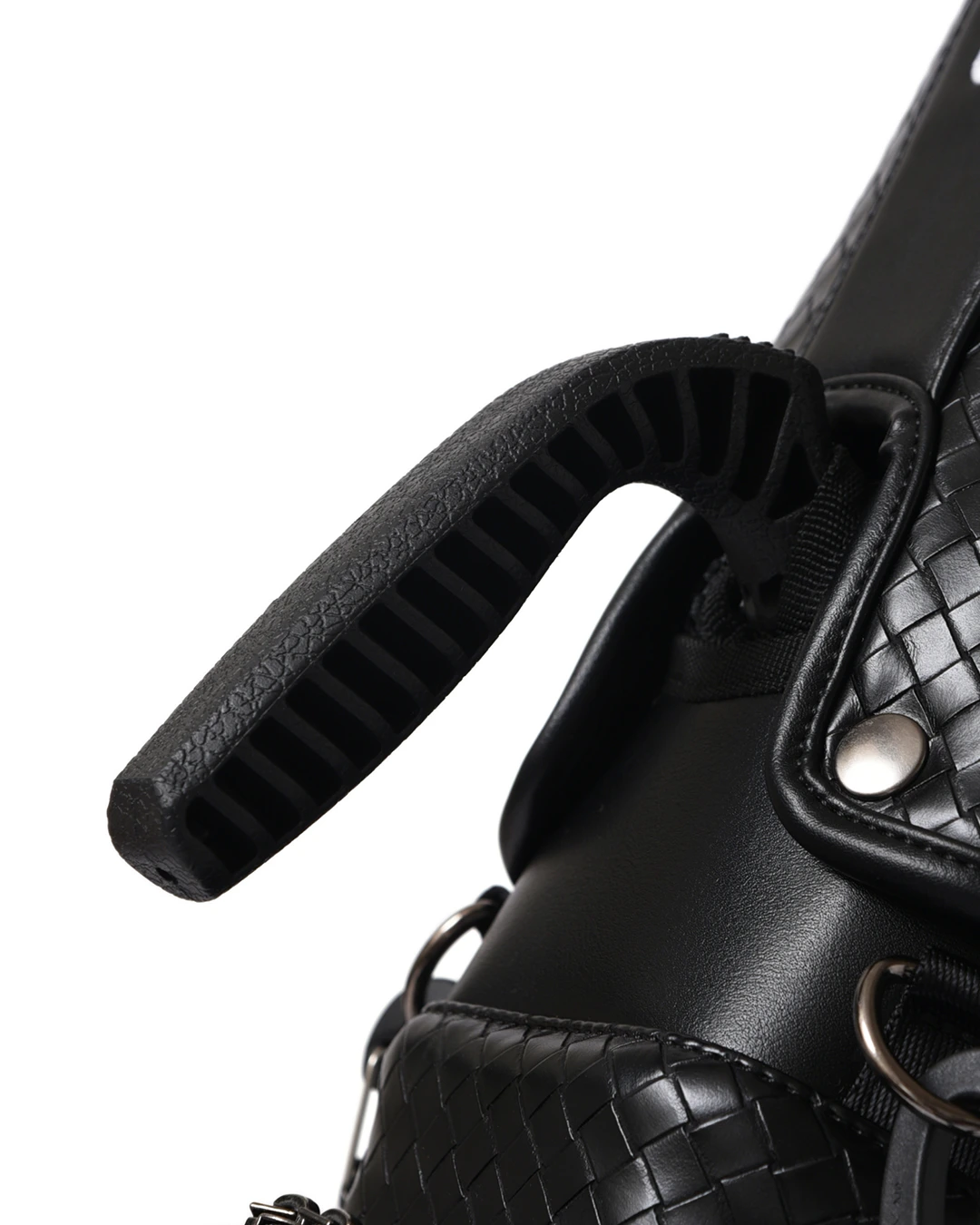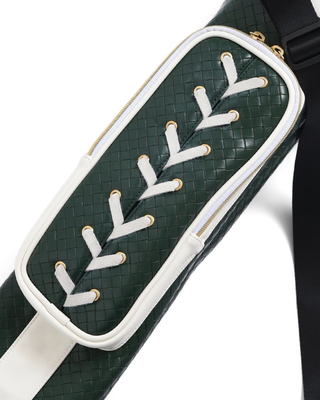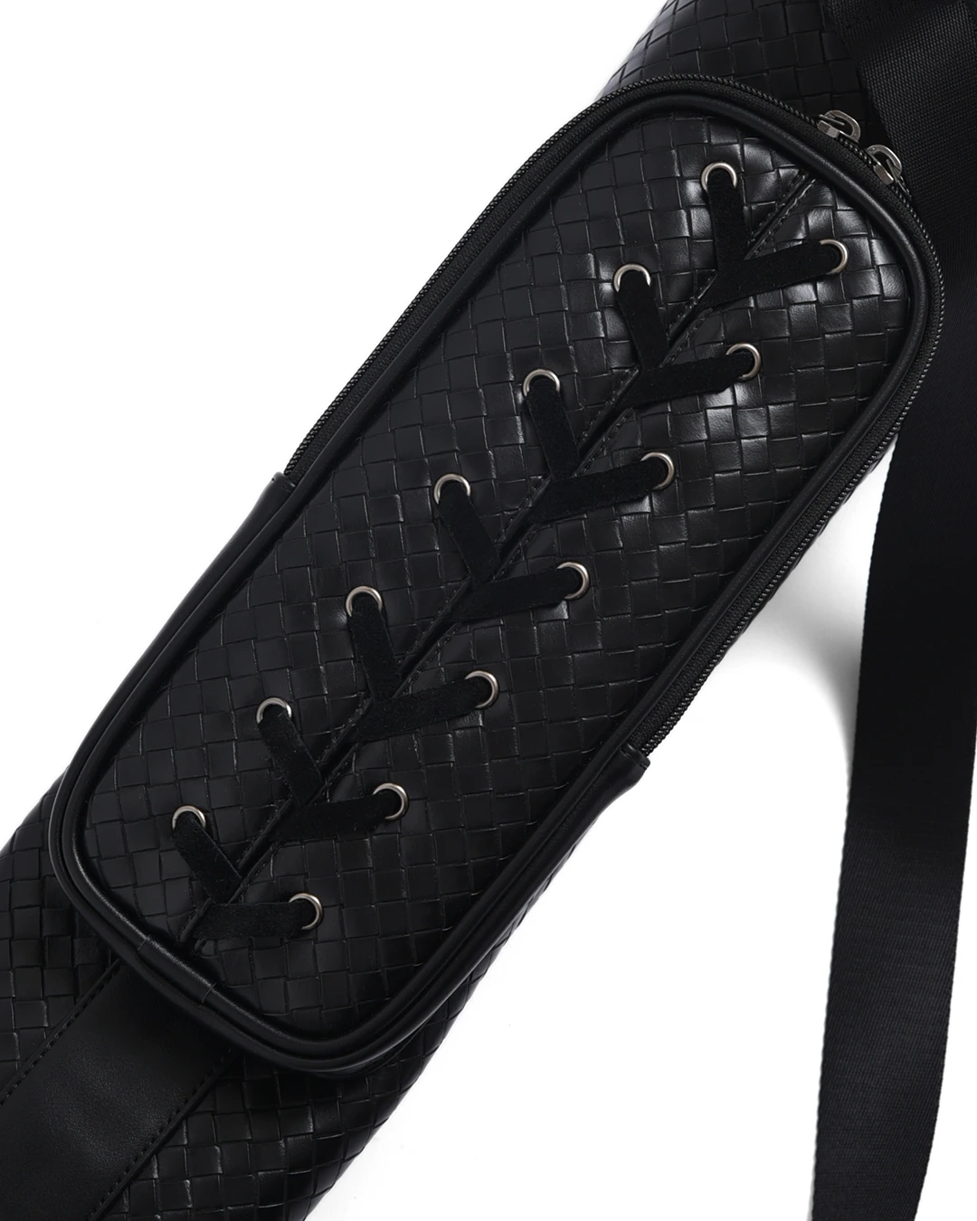 中央ポケットに施されたアイレットとスウェードの編み込みがポイントです。